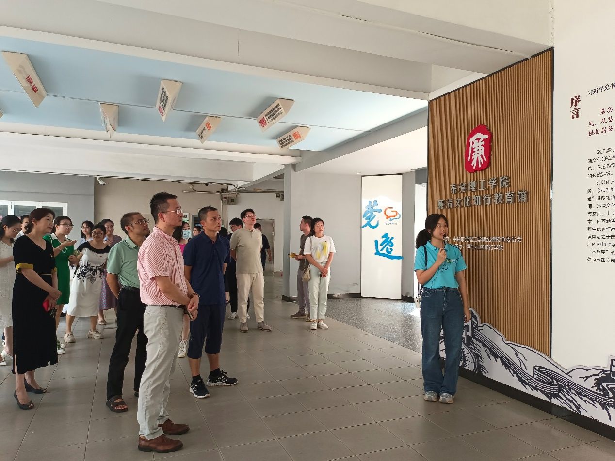 球王会官网廉洁文化知行教育馆与莞逸社区“一廊三室”深度融合,将廉洁文化与生活空间、学习空间、网络空间、环境文化有机结合,营造生活化、场景化的思想政治教育空间。在讲解员的带领下,教师们先后参观“守正”“溯源”“浸润”“共鸣”四个篇章,学习了党史、名人故事、典型榜样、传统文化、师生优秀作品等。