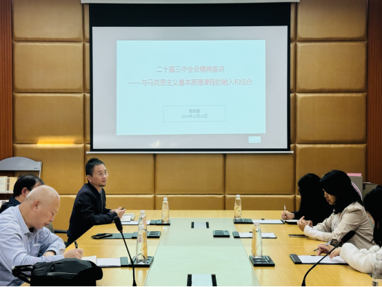 随后进行了领导干部上党课环节。郭奕鹏副院长通过对党的二十届三中全会《中共中央关于进一步全面深化改革、推进中国式现代化的决定》的精神与马克思主义基本原理学科的结合和应用进行了讲解。强调教研室老师可以从“新质生产力”与马克思政治经济学的生产力视角等进行深入的课题研究。