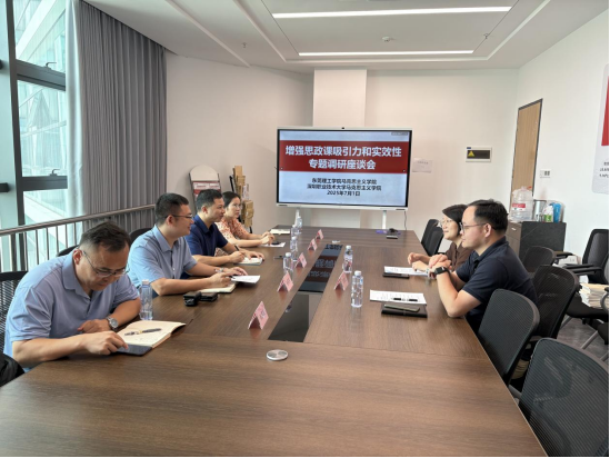 为深入贯彻落实立德树人根本任务,切实提升思想政治理论课的吸引力与实效性,7月1日,球王会副院长银锋、党委副书记谢霄男、中国近现代史纲要教研室党支部书记、主任陈立中、马克思主义基本原理教研室党支部书记、主任岳凤、思政课社会实践教研室主任张庆吉前往深圳职业技术大学球王会官网开展调研交流,围绕学校党委领导重视情况、思政课教学评价、师资队伍建设等工作开展交流。